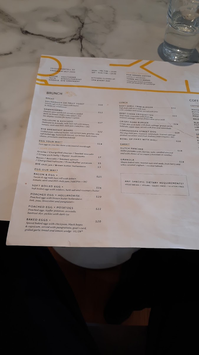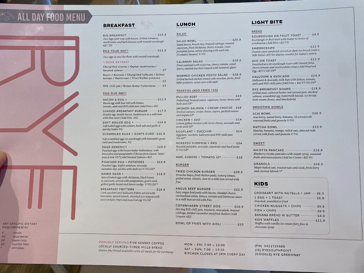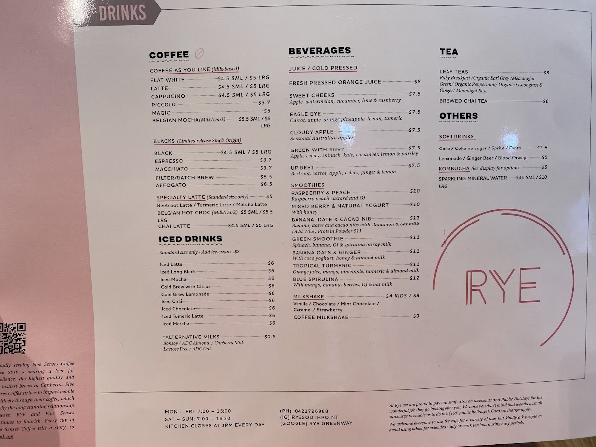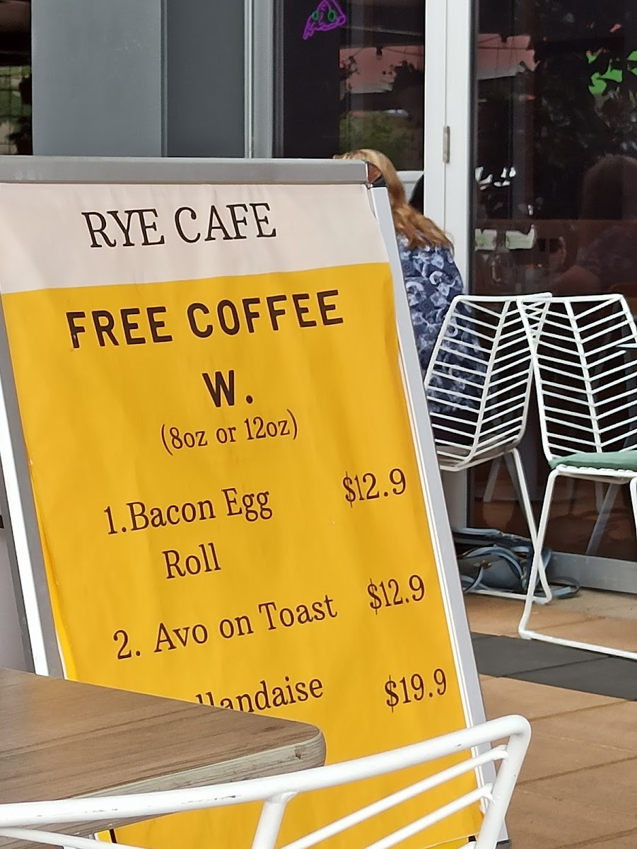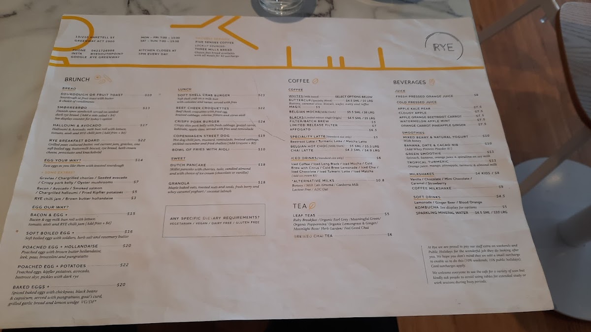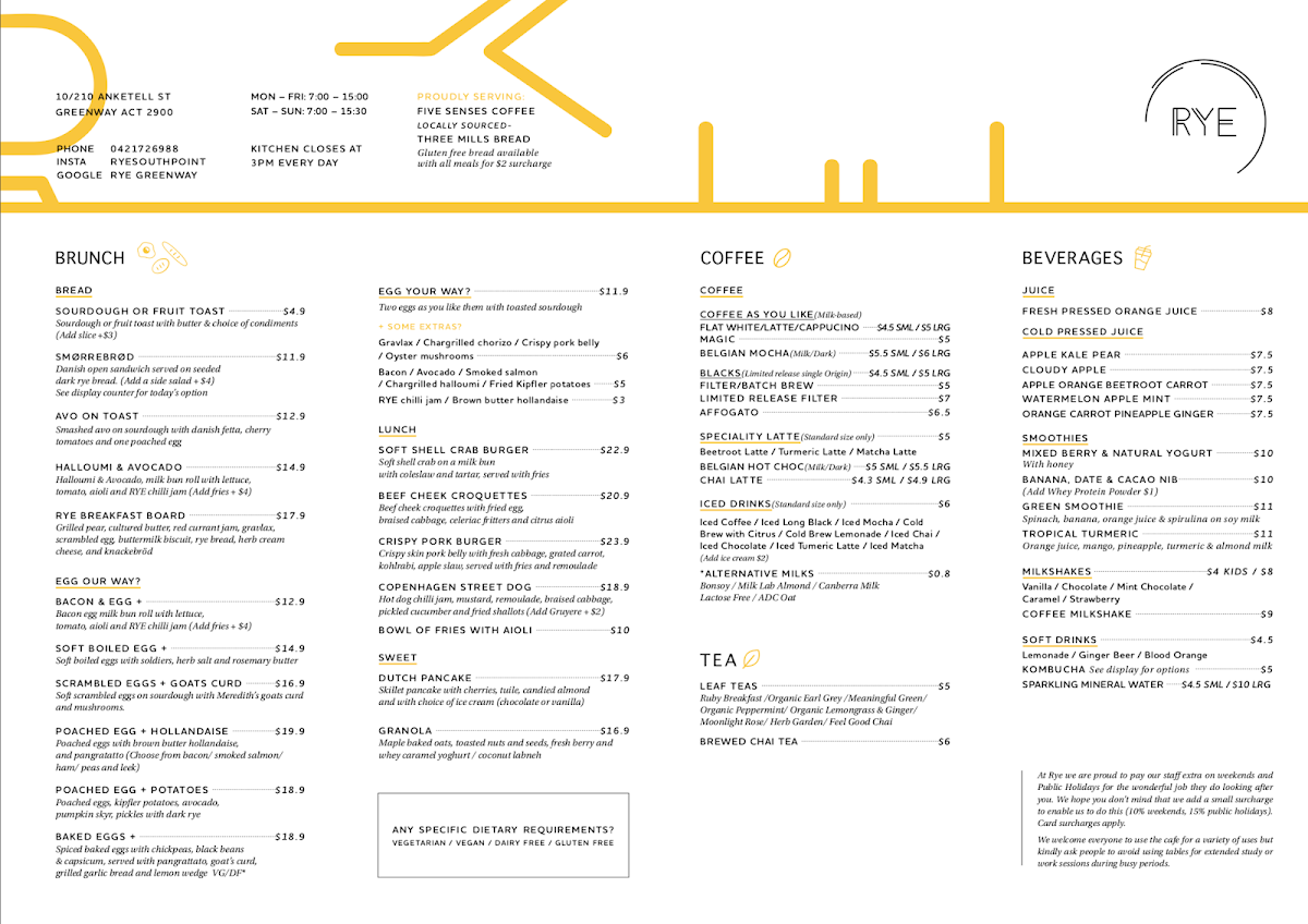 RYE Cafe Tuggeranong Menu